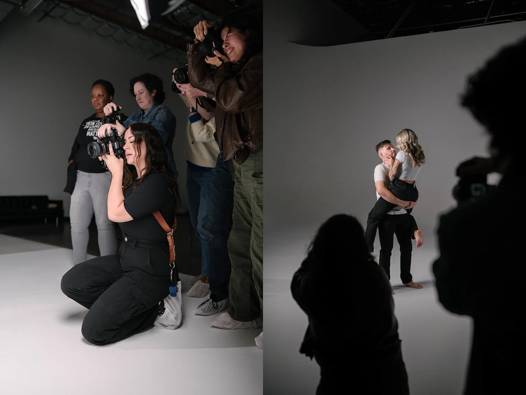 The first shoot was focused on posing & directing couples. We used a continuous light source by Nanlite so that all students could shoot at the same time. Shooting with continuous light during the posing/directing portion of the workshop allowed everyone the mental space to not have to think of too many new things at once.